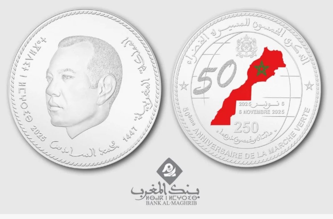 بمناسبة تخليد الذكرى الخمسين للمسيرة الخضراء المظفرة، أعلن بنك المغرب عن إصدار قطعة نقدية تذكارية فضية من فئة 250 درهمًا، تكريماً لهذه المناسبة الوطنية الغالية التي تجسد ملحمة الوحدة الترابية والوفاء للوطن.