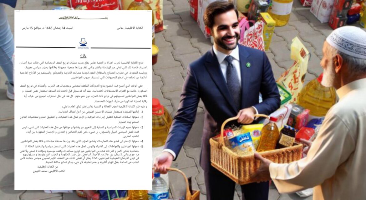 تتابع الكتابة الإقليمية لحزب العدالة والتنمية بفاس بقلق بالغ عمليات توزيع القفف الرمضانية في أحياء المدينة، خاصة تلك التي تعاني من الهشاشة والفقر، والتي تقف وراءها جمعية تربطها علاقة بحزب سياسي معروف ورئيسه المتورط في تضارب المصالح واستغلال النفوذ لخدمة مصالحه الشخصية، مما يزيد من معاناة المواطنين الذين يعانون من أسعار المحروقات المرتفعة.
